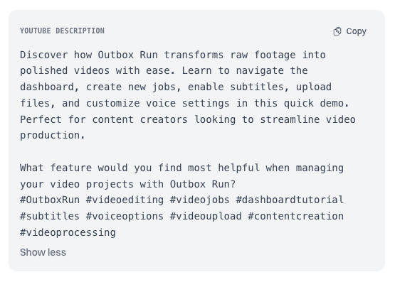 Metadata, chapters, and a publish-ready package come out of the same run. YouTube integration shipping next.