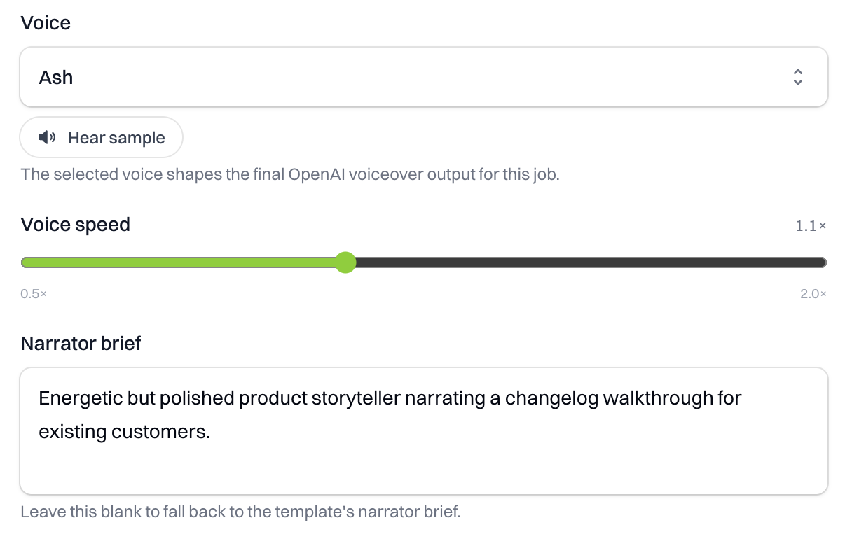 Choose your voice provider, match tone to the format, and let the system keep the voiceover aligned with the cut.